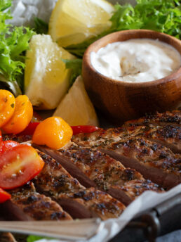 With BBQ season underway, a classic chicken souvlaki pita is always a good idea! Simply set them to marinate as much ahead as you can, then grill and enjoy.