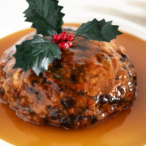 A traditional steamed Christmas pudding (plum pudding), served with a warm butter and rum sauce. This Christmas pudding recipe is made without suet.