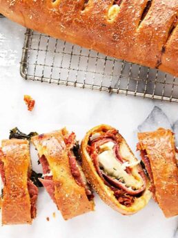 A classic stromboli recipe, made with homemade stromboli dough and filled with salami, cheese, roasted red peppers, pesto and pepperoncini. Perfect for everyday eating, picnics or tailgating!