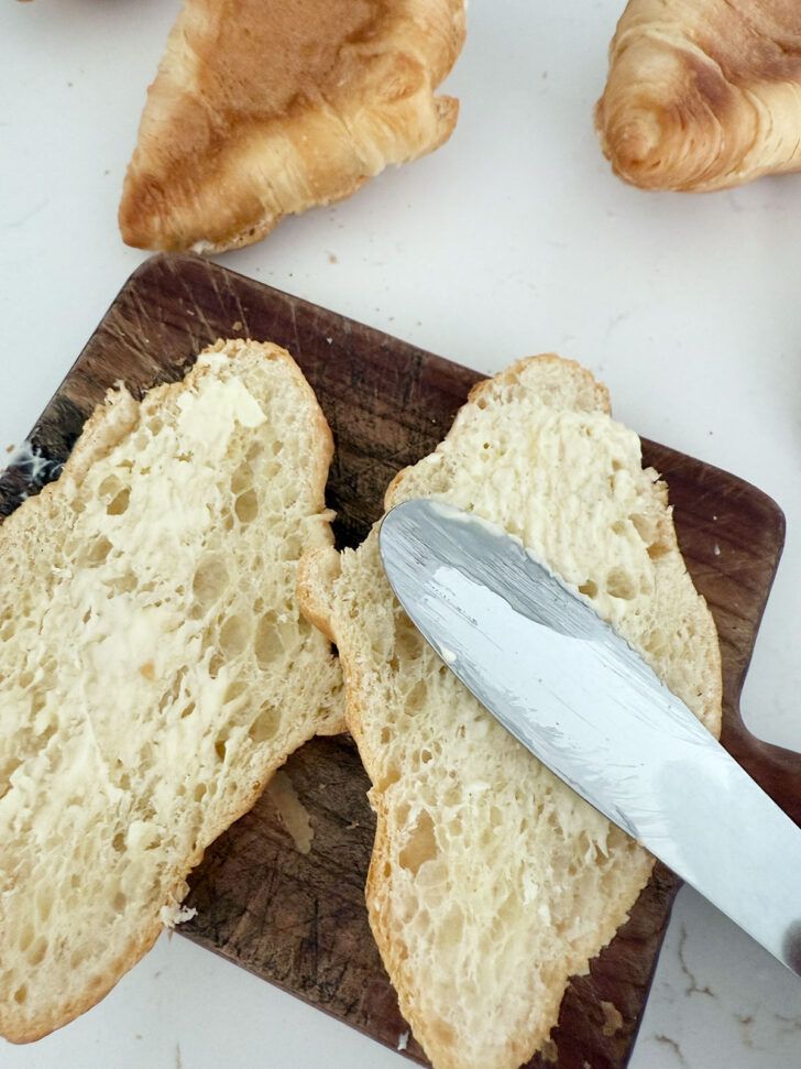- Start by halving the croissants length-wise and then buttering each half.