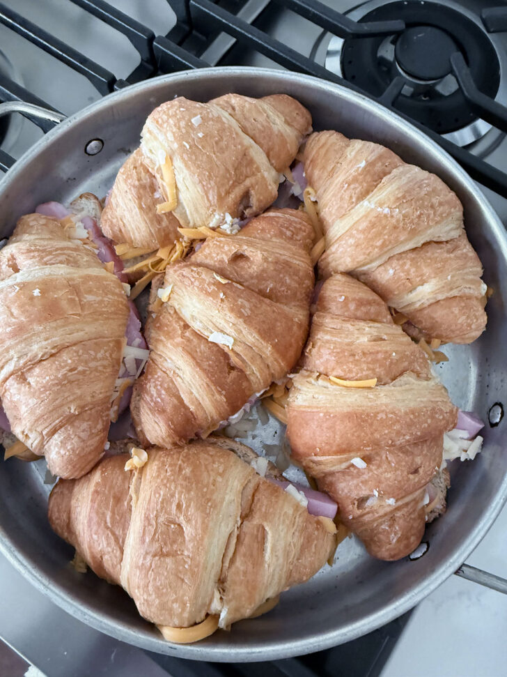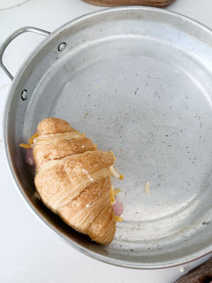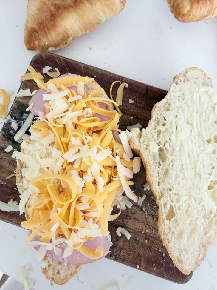 - Halve the croissants lengthwise and butter the inside of each piece. Place the sliced ham on top of the bottom piece. Top with shredded cheese, then place the top of the croissant. Place the filled croissant into a buttered 10-inch-round baking dish (or a similar size that allows for the croissants to fit snugly together, but also to lay flat). Repeat with the remaining croissants until all 6 are arranged in the baking dish.