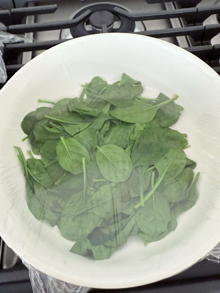 - Wilt the fresh spinach in a plastic wrap-covered bowl for 45-60 seconds (or you can wilt in a skillet over medium heat on the stovetop with a splash of water.) Carefully remove the plastic wrap (watch for escaping steam) and allow the spinach to cool while you mix up the egg mixture.