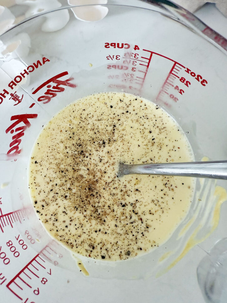 - Mix up the egg and milk mixture and season with salt and pepper.