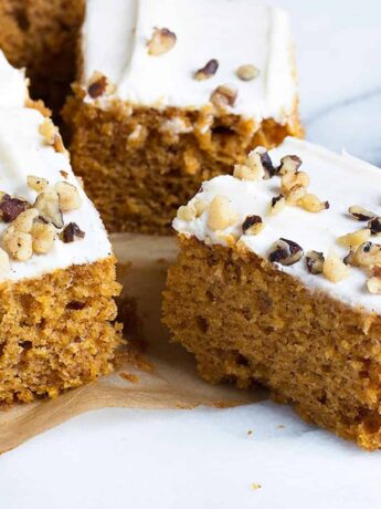 An easy and delicious pumpkin sheet cake, topped with a cream cheese frosting. A great snacking cake or dessert for a crowd!