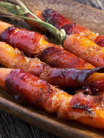 These 3-ingredient maple glazed bacon wrapped carrots are a super easy way to kick your carrots up a notch! A perfect vegetable side dish for entertaining.