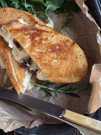 This Knife and Fork Camembert Grilled Cheese, also features Gruyere cheese, Balsamic Onions on Sourdough bread and a drizzle of honey!